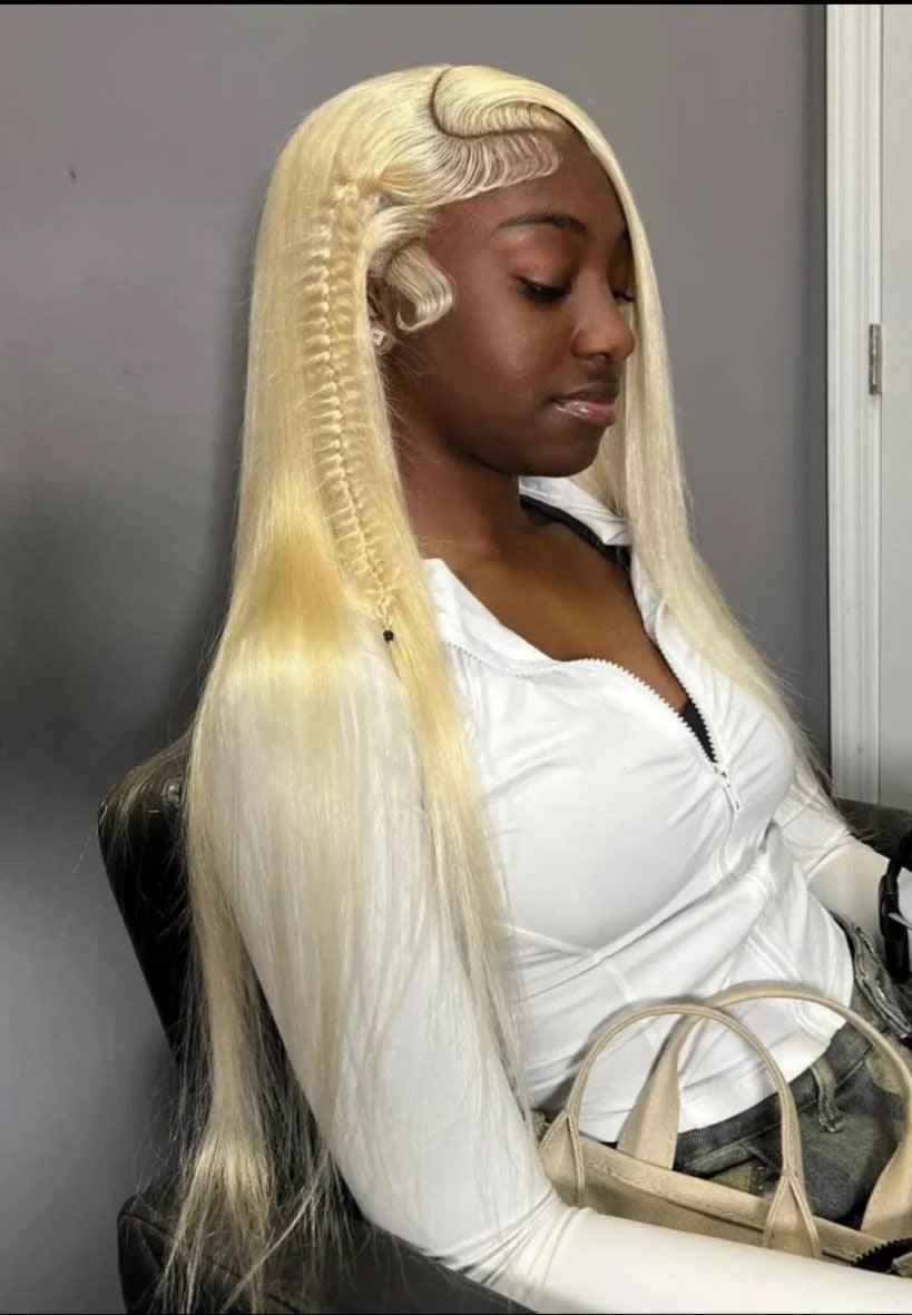 The wig is made of straight Brazilian hair and comes in the 613 blonde color. It features a size 13x4 pre-plucked and bleached lace frontal for a seamless look. You have the flexibility to dye and tone the hair to your liking.