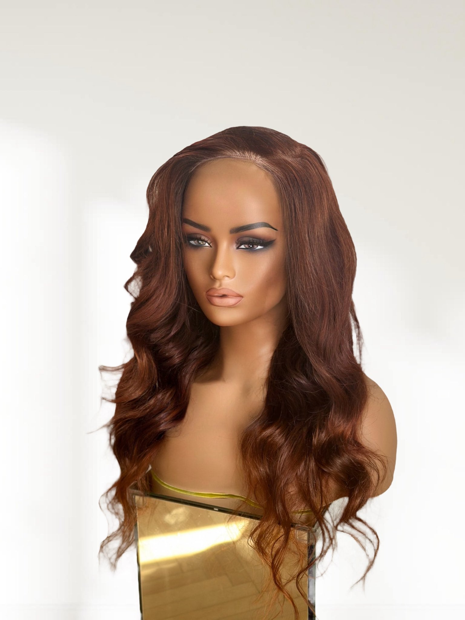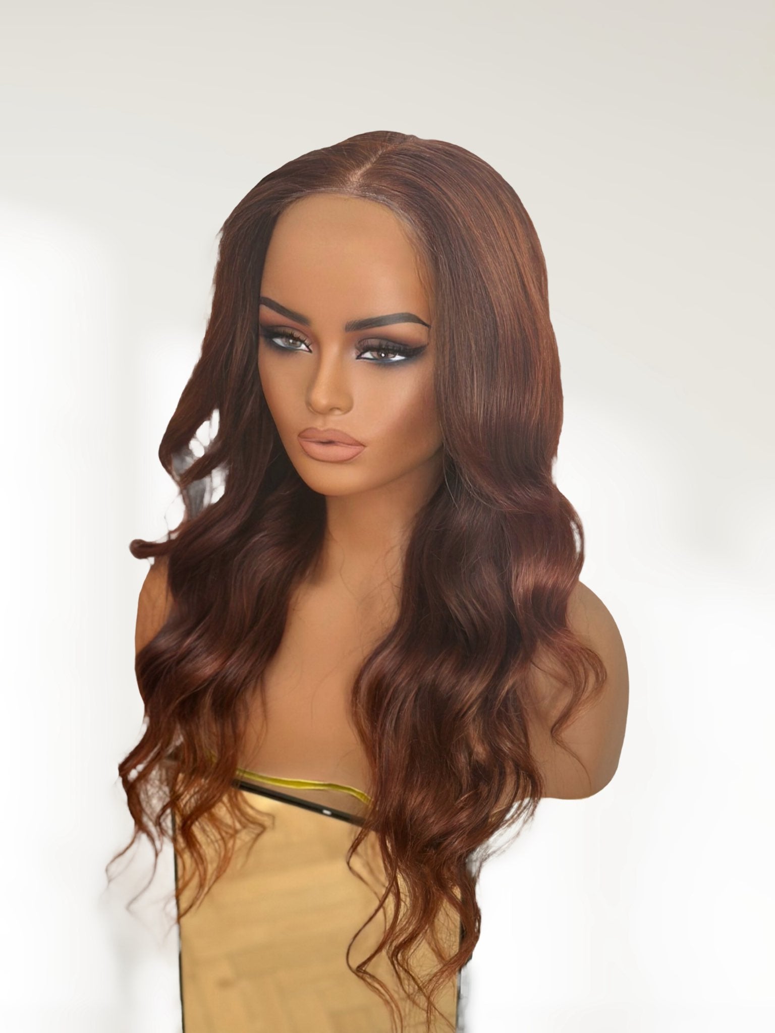 The wig features a loose body wave texture with a lenght of 24 in the picture. The colour is a mix of brown copper and Auburn for a luxury finish. The closure comes in a 5x5 size and is pre-plucked and bleached for a natural look.